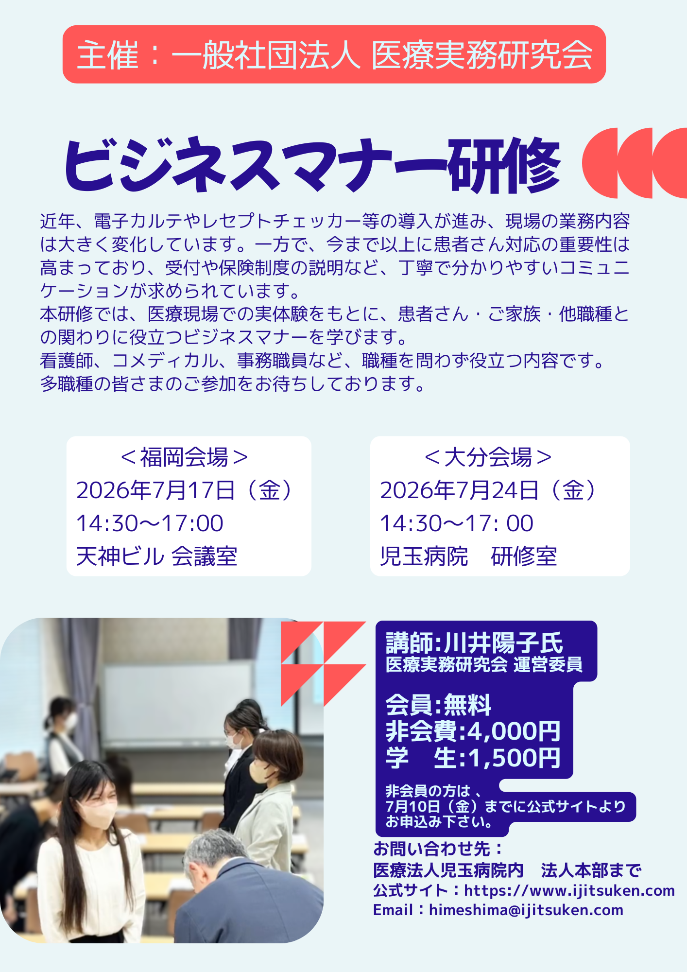 | 毎年恒例のビジネスマナー研修 新人・中堅職員対象 福岡会場 福岡天神ビル 会議室 7月17日(金) 14:30~17:00 大分会場 児玉病院 研修室 7月24日(金) 14:30~17:00 ※申込みは後日掲載します |